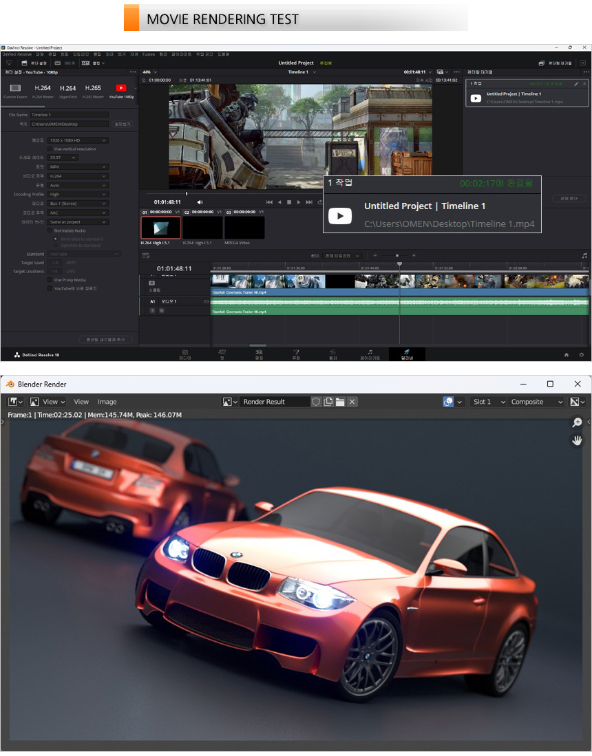 영상편집 S/W 다빈치 리졸브를 이용해 랜더링 테스트를 진행하고 있는 모습으로 (640MB, 920MB, 990MB 4K 동영상을 단일 동영상으로 랜더링, FHD 해상도에 H.264 비디오 코덱) 2분 17초가 소요되는 것을 확인할 수 있었다. 또한 블랜더 랜더링 테스트에서도 4~5분대의 시간을 보여주는 일반 PC와 달리 2분대의 빠른 랜더링 시간을 보여주었다. (게이밍에 특화된 모델이지만 영상편집 등의 작업용으로도 유용하게 사용할 수 있다.)