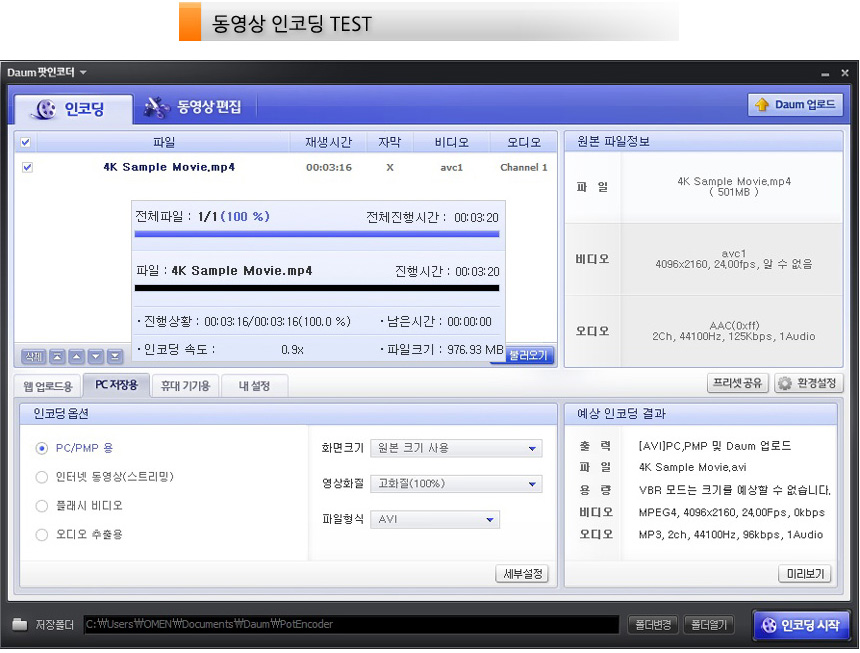 다음 팟인코더를 이용해 4K 동영상의 인코딩 테스트를 진행하고 있는 모습으로 3분 20초의 짧은 인코딩 시간을 보여주었다.