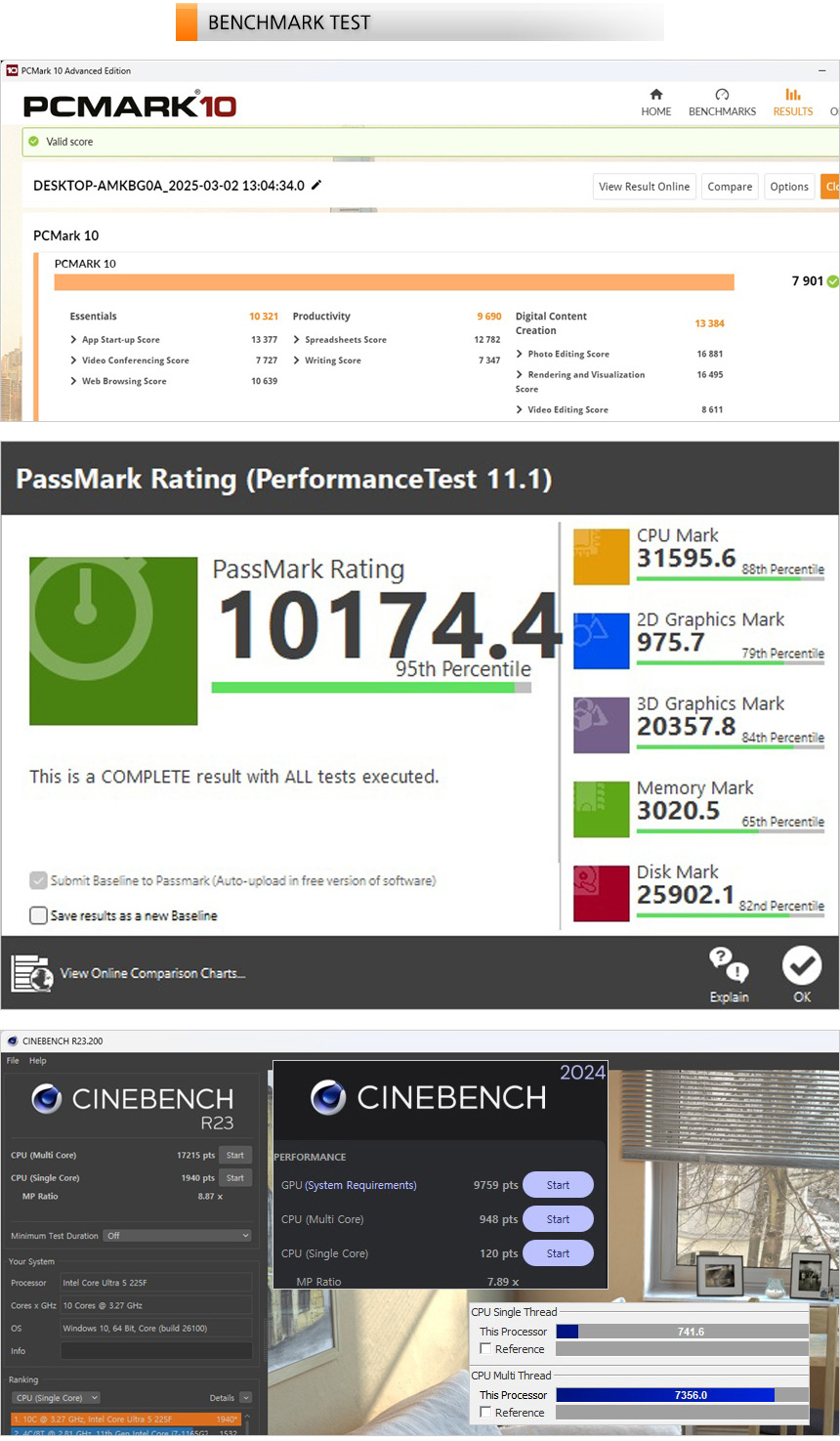 벤치마크 프로그램을 이용해 성능을 확인하고 있는 모습으로 최상급 게이밍 PC와는 다소 차이가 있지만 최신 게임을 즐기기에 부족함 없는 성능을 보여주었다. CPU 성능도 뛰어난 편으로 작업이나 멀티테스킹 등도 원활하게 실행할 수 있다.
