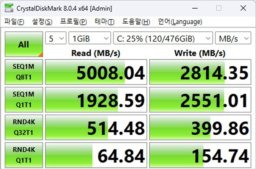 저장장치의 속도를 확인하고 있는 모습으로 PCIe 4.0 NVMe SSD를 사용해 빠른 속도를 즐길 수 있다. 또한 512GB 용량을 지원해 다양한 게임을 설치해 즐길 수 있다.