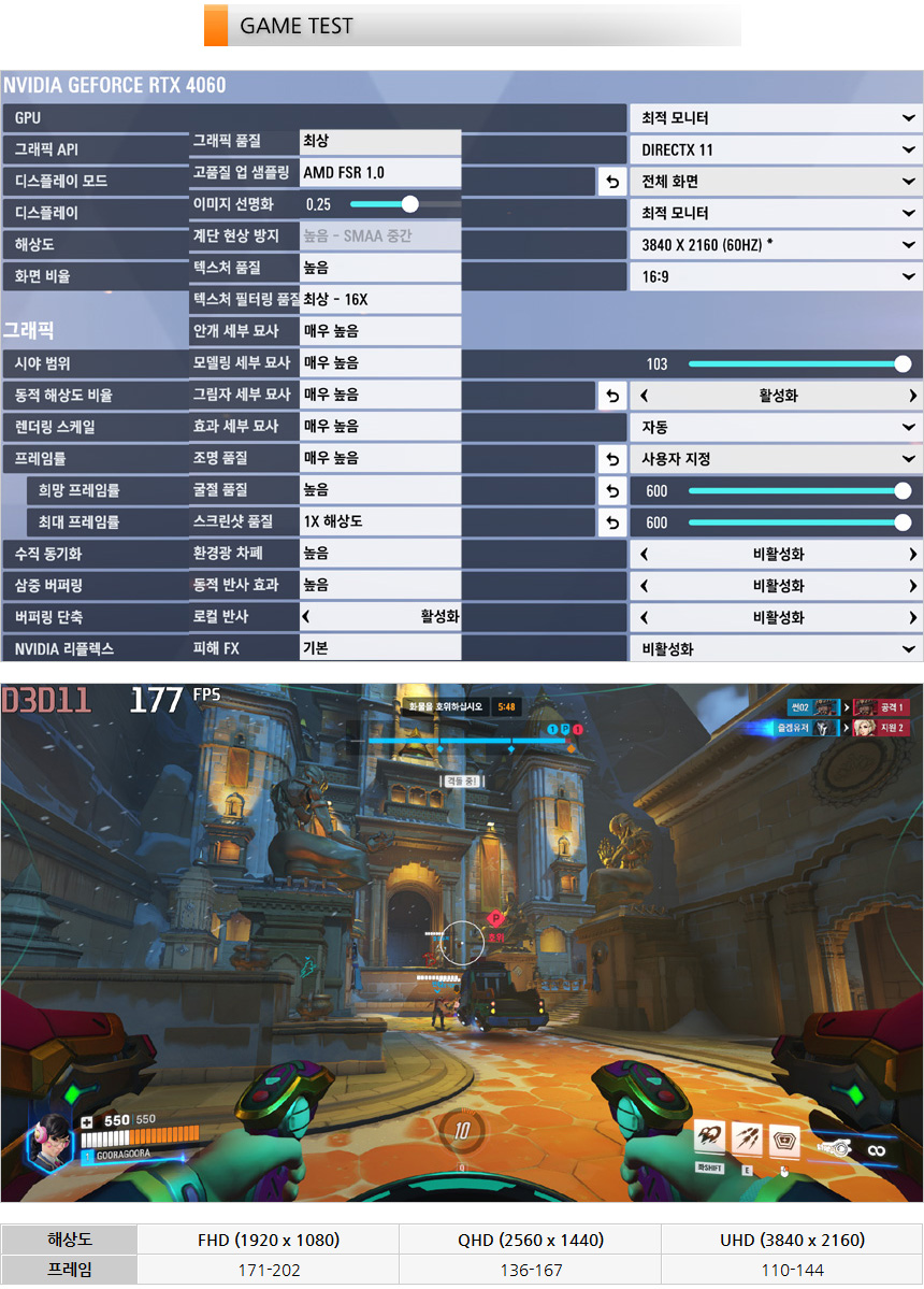 오버워치2를 이용해 게임 테스트를 진행하고 있는 모습으로 최상 옵션에서 모든 해상도가 100 프레임 이상을 보여주었다. FHD와 QHD 해상도는 상위 옵션에서도 게이밍 모니터 사용에 불편이 없으며 4K 의 경우 옵션 조정으로 프레임을 확보해 주면 144Hz 게이밍 모니터 사용이 가능하다.