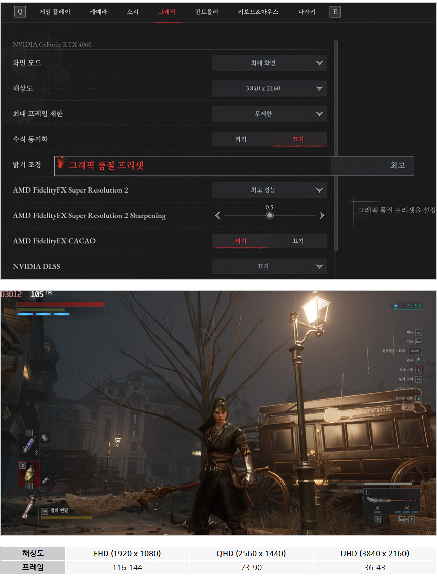P의 거짓을 최고 옵션에서 플레이 하고 있는 모습으로 디아블로 4 와 비슷한 모습으로 보여주었다. 4K 에서 FSR2를 적용하면 96-120 까지 프레임이 올라가 훨씬 부드럽게 플레이 할 수 있다.