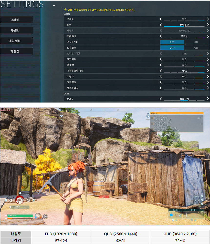 팰월드를 최고 옵션에서 플레이 하고 있는 모습으로 고성능을 필요로 하는 게임이지만 부드럽게 실행할 수 있었다. 4K 에서 DLSS를 성능으로 설정하면 63-79까지 프레임이 올라가 더 부드럽게 게임을 즐길 수 있었다.