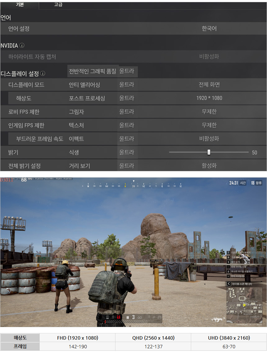 배틀그라운드를 울트라 옵션으로 플레이 하고 있는 모습으로 QHD 에서 100 프레임 이상으로 동작해 게이밍 모니터를 사용하는데 불편은 없을 것이다. (국민옵션 등을 적용해 충분히 프레임을 확보한 상태에서 게임을 즐기기 바란다.)