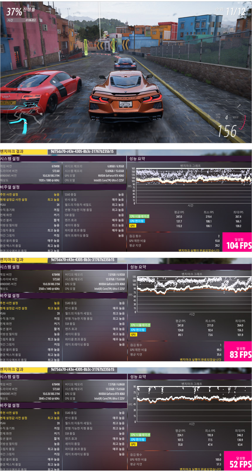 포르자 호라이즌5 벤치마크를 실행한 모습으로 해상도나 옵션에 상관없이 부드럽게 게임을 즐길 수 있는 높은 프레임을 보여주었다.