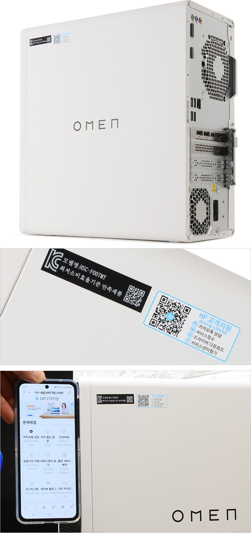 PC 우측면의 모습으로 상단에 QR코드가 부착된 것을 확인할 수 있다. QR코드를 스마트폰으로 스캔하면 고객지원 페이지로 연결되어 PC에 문제가 발생했을 때 손쉽게 상담 받을 수 있으며 (유저들에게 익숙한 카카오톡 상담을 지원한다.) 윈도우 재설치시 드라이버를 다운로드 할 수 있다.
