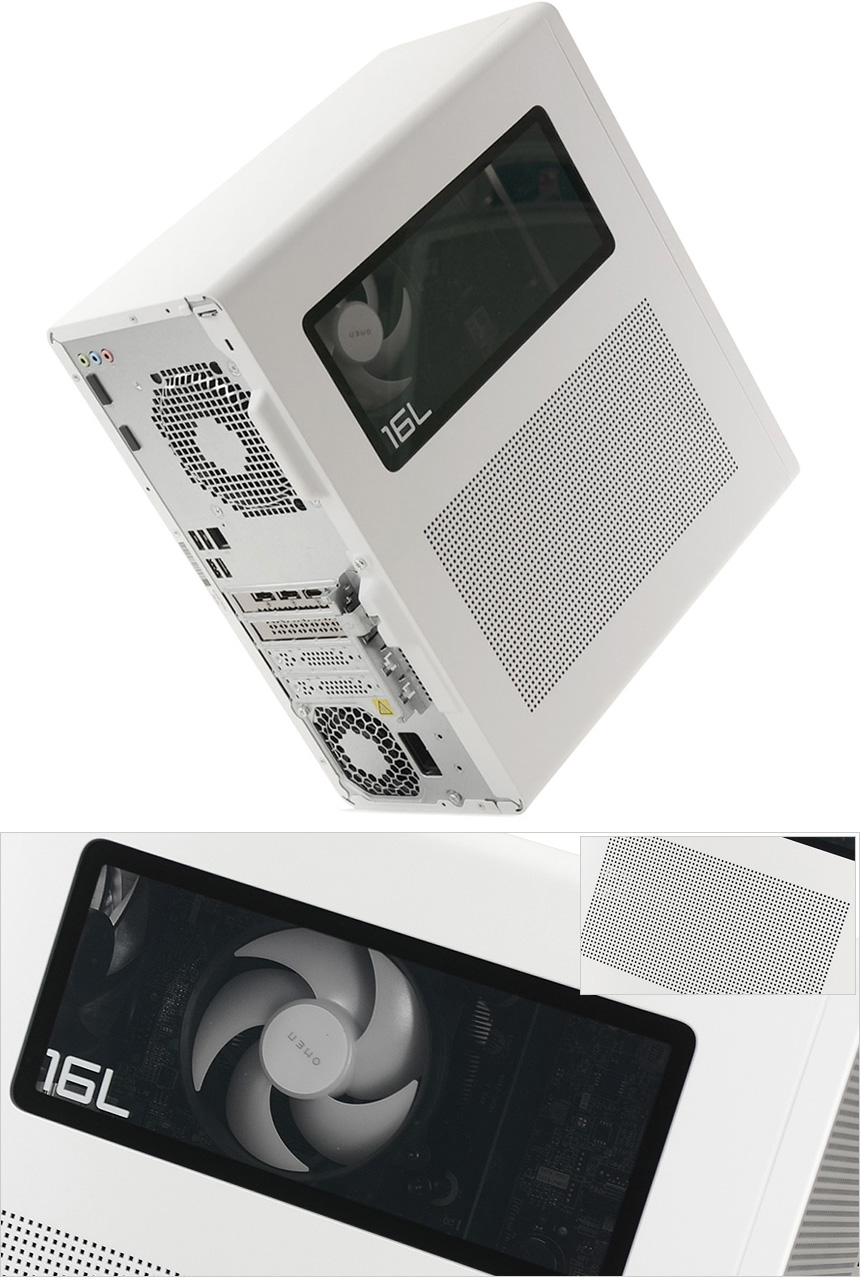 PC의 디자인은 프리미엄 라인업인 OMEN 시리즈의 최신작 답게 상당히 세련된 것을 확인할 수 있다. 화사한 화이트와 진한 블랙컬러의 조화가 인상적이며 높은 마감완성도로 고급스러운 느낌을 살린점에도 좋은 점수를 주고 싶다. 또한 측면에 Glass를 추가하고 RGB 팬을 적용해 게이밍 PC 다운 화려함도 옅볼 수 있었다. (작고 세련된 게이밍 PC를 구입하고 싶다면 더할나위 없는 선택이 될 것이다.)