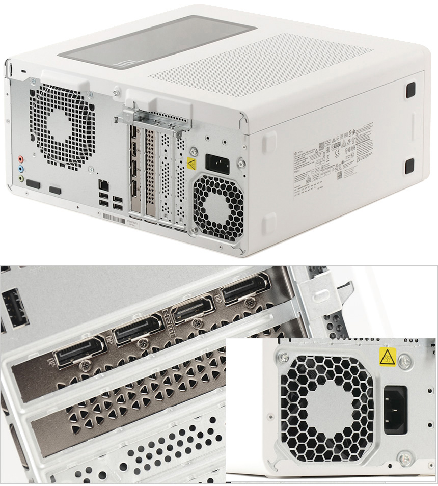 PC 후면부의 모습으로 뜨거워진 내부 공기가 원활하게 빠져나갈 수 있도록 후면에 팬이 설치되어 있고 측면에는 오디오 단자와 4개의 USB 단자 (USB 2.0), 네트워크를 위한 이더넷 단자를 제공한다. 또한 기본 장착된 RTX 4060 그래픽카드에는 3개의 DP 단자와 1개의 HDMI 단자를 지원해 4K 고해상도 모니터 연결이 가능하고 멀티 모니터 환경도 쉽게 구축할 수 있다.