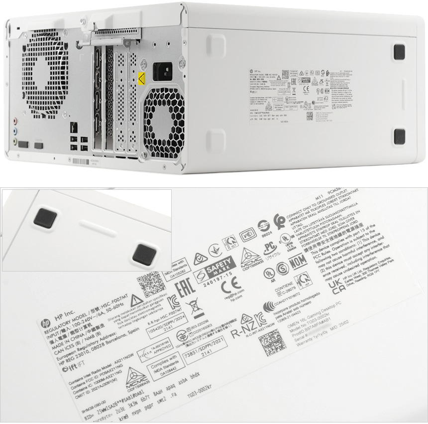 PC 바닥면의 모습으로 고무패드가 설치되어 미끄러짐을 방지한다. 또한 중앙에는 제품의 정보를 확인할 수 있는 스티커가 부착되어 있다.
