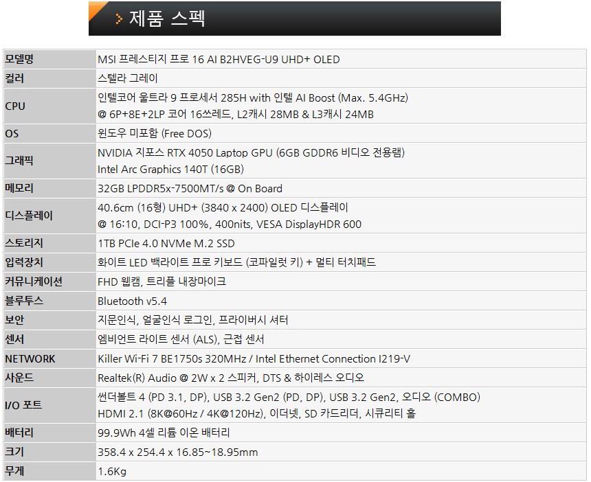 휴대성까지 챙긴 프리미엄 크리에이터 노트북, MSI 프레스티지 프로 16 AI B2HVEG-U9 UHD+ OLED