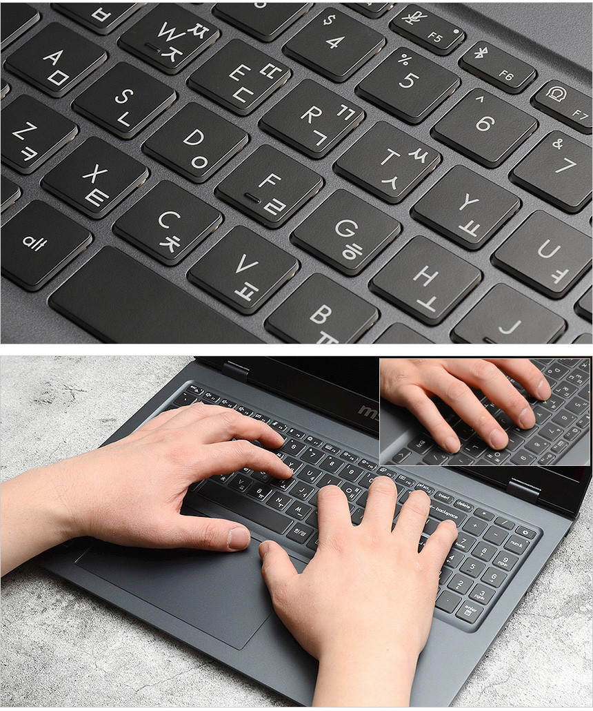 타이핑 테스트를 진행하고 있는 모습으로 대화면 노트북 특유의 넓은 키간격으로 오타없이 고속 타이핑이 가능했으며 팜래스트가 손을 완전히 받쳐주어 손이나 손목등의 피로감이 크지 않았다. 키압은 낮은 편이며 1.7mm 의 긴 트래블과 높은 탄력으로 손가락의 부담없이 타이핑 할 수 있었다. 장시간 타이핑 작업으로 해야하는 직장인이나 대학생이 편하게 사용할 수 있을 것이다.