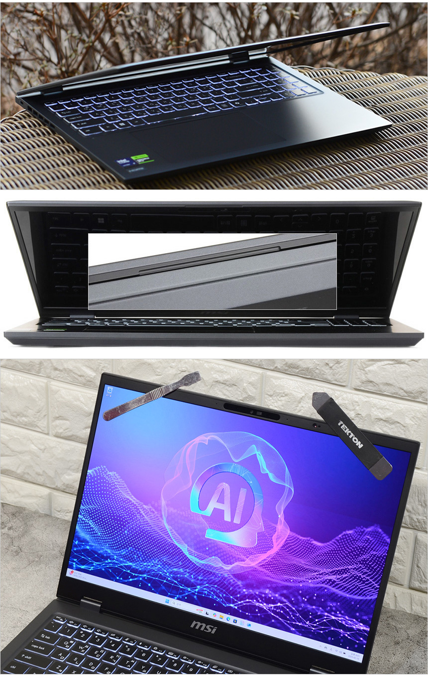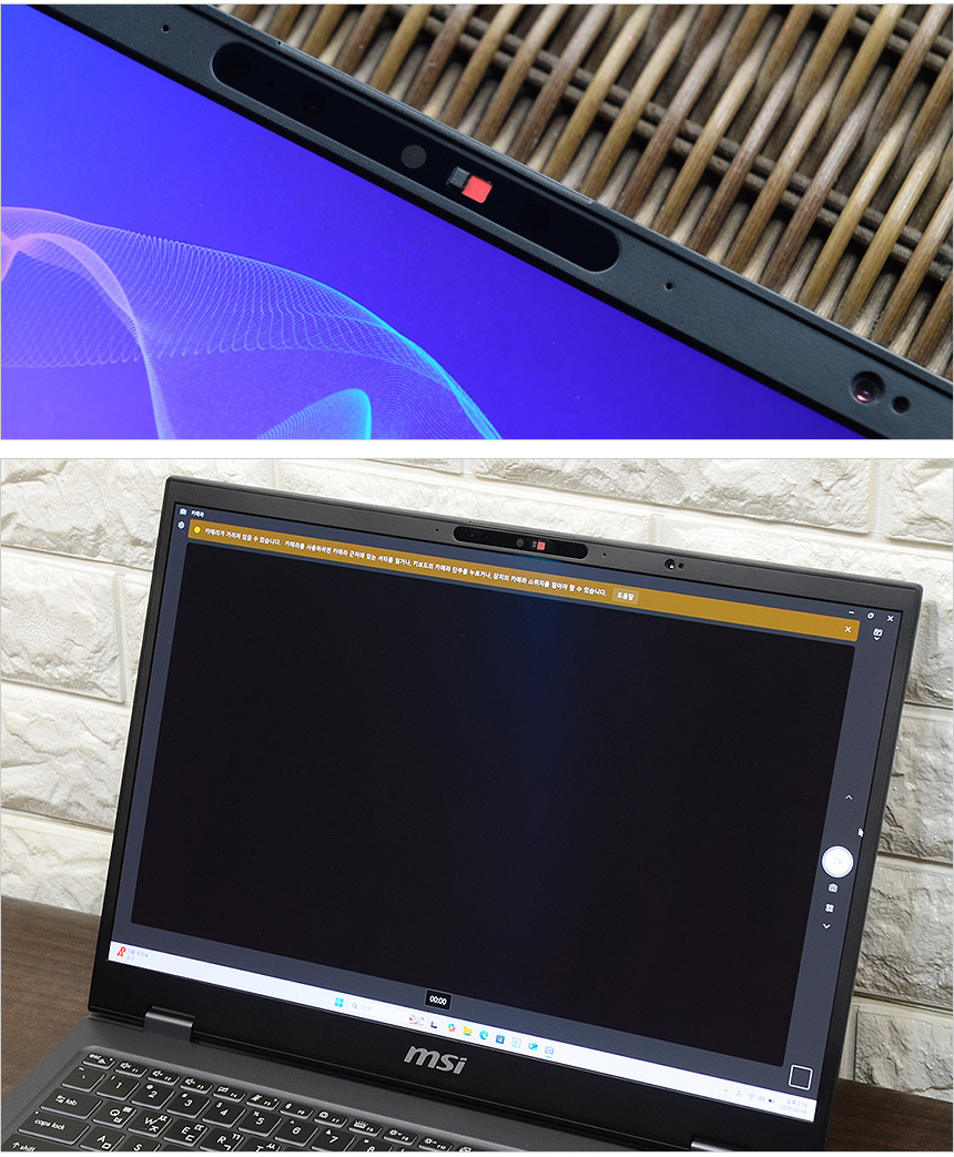 웹캠을 이용한 비주얼 해킹이나 사생활 침해를 원천적으로 차단할 수 있도록 카메라에 프라이버시 셔터가 장착된 것을 확인할 수 있다. 물리적으로 카메라를 가려주기 때문에 해킹으로 노트북 권한을 획득 하더라도 사용자나 주변 상황을 전혀 볼수 없다. (동영상을 통해 자세히 확인하기 바란다.)