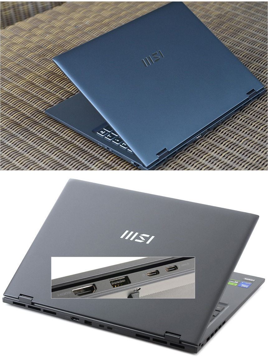 노트북 후면의 모습으로 양 측면에 통풍구가 설치되어 있고 중앙에는 8K@60Hz와 4K@120Hz 디스플레이 연결이 가능한 HDMI 2.1 단자를 제공한다. 또한 주변기기 연결을 위해 A타입과 C타입의 USB 3.2 Gen2를 지원하며 썬더볼트 4 단자가 설치되어 빠른 데이터 전송이 가능하다.