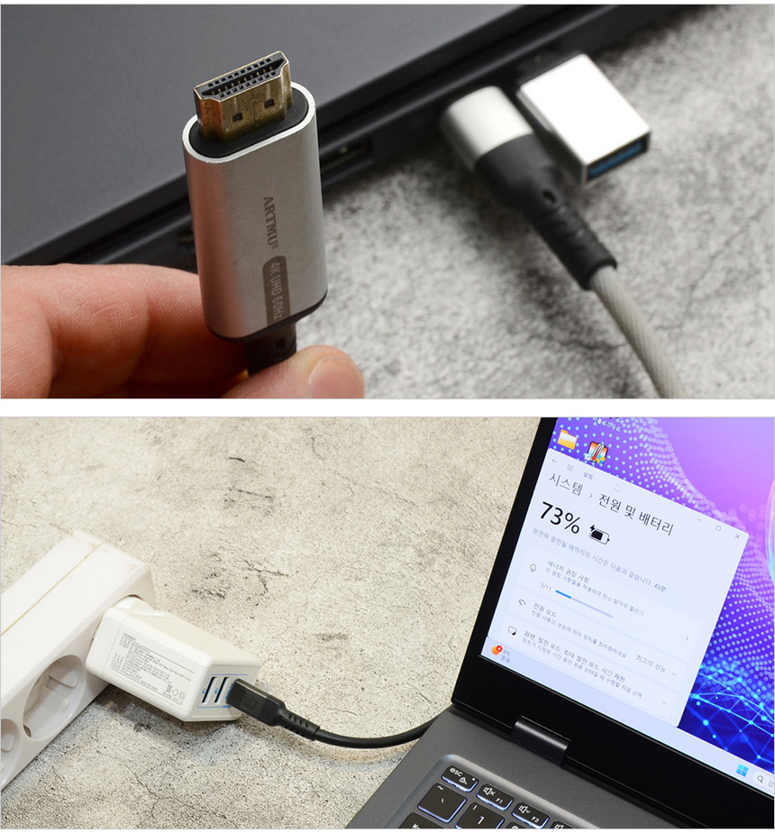 썬더볼트 4 단자와 C타입 단자는 빠른 데이터 전송이 가능할 뿐만 아니라 140W PD 충전을 지원해 (시중에 판매되는 65W PD 충전기와 100W PD 충전기 모두 정상적으로 인식하는 것을 확인했다.) 어디서나 편하게 전원을 공급할 수 있다. 또한 디스플레이 출력을 지원해 모니터를 연결해 사용할 수 있으며 A타입 젠더를 장착하면 일반 주변기기 연결도 가능하다. @ 오피스나 웹서핑 등 캐주얼한 작업시에는 65W PD 충전기도 충분하다. 단, 전문작업시에는 100W 이상의 PD충전기를 사용하기 바란다.