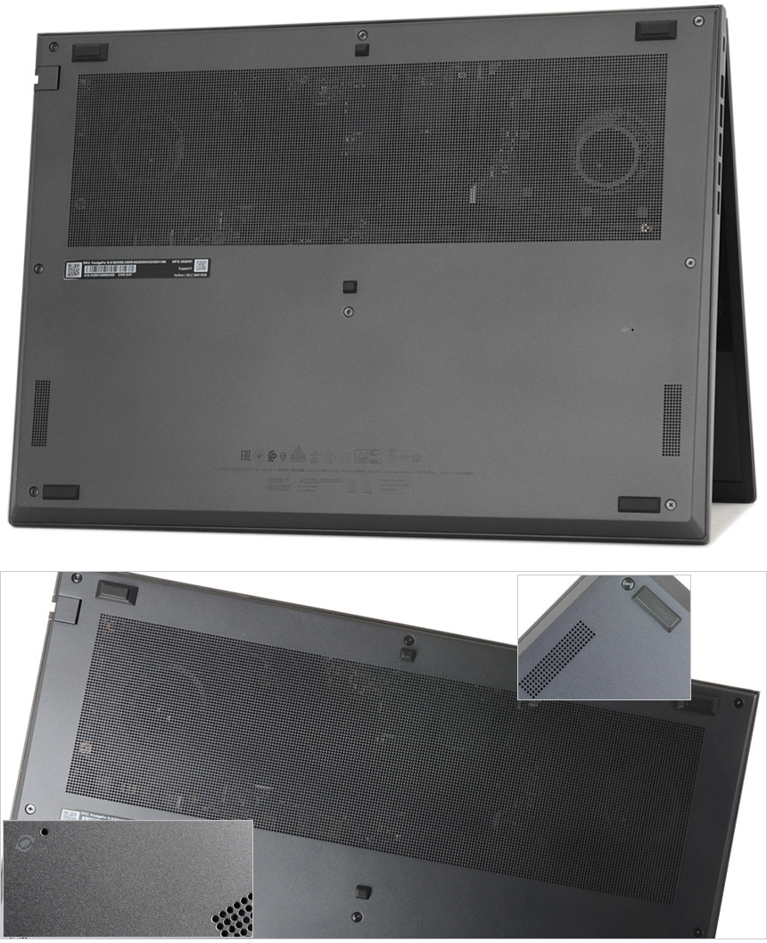 노트북 바닥면의 모습으로 칩셋이 설치된 상단에 통풍구가 설치된 것을 확인할 수 있으며 사방에 고무패드가 장착되어 미끄러짐을 방지한다. 또한 하단 양 측면에는 스피커가 설치되어 퀄리티 높은 사운드를 즐길 수 있으며 리셋 버튼도 지원한다.