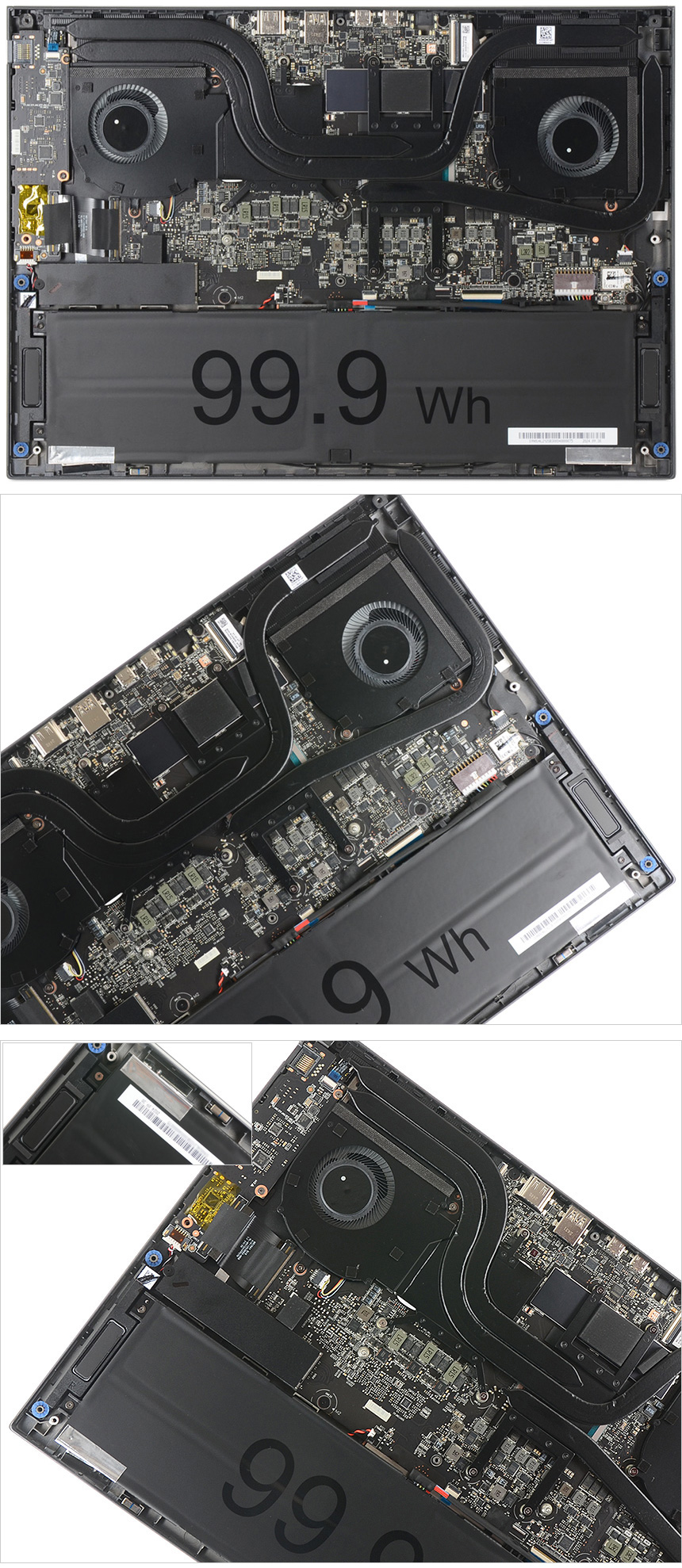 바닥면 내부의 모습으로 상단에는 CPU의 열을 식혀주기 위해 듀얼팬과 히트파이프가 장착되어 있으며 하단에는 99.9Wh 대용량 리튬이온 배터리를 비롯해 스피커와 마그네틱, 무선랜 안테나 등이 설치된 것을 확인할 수 있다.