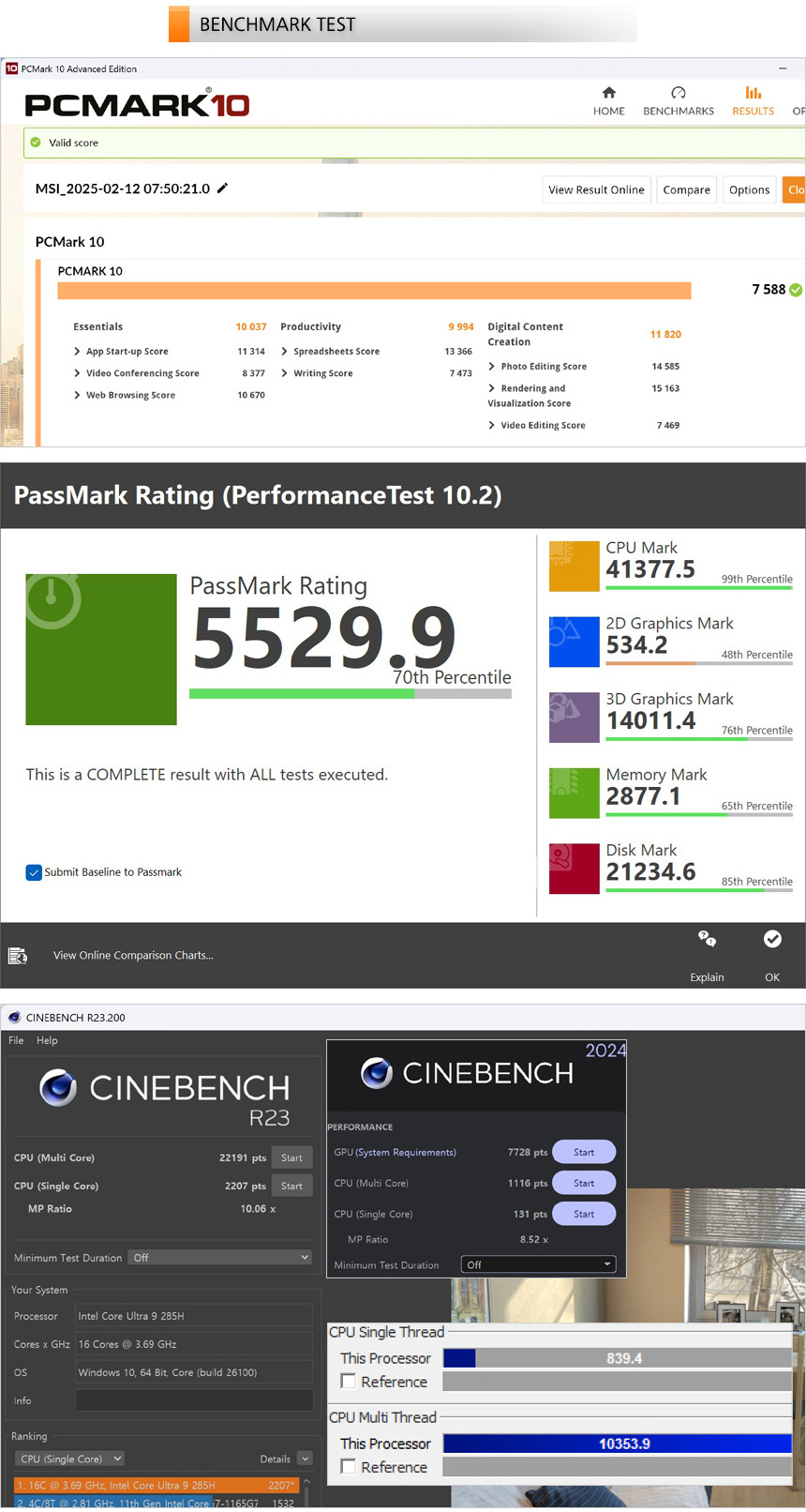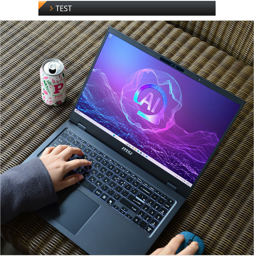 벤치마크 프로그램을 이용해 노트북의 성능을 확인하고 있는 모습으로 기존에 테스트 했던 루나레이크 & 애로우레이크 노트북들과 확연한 CPU 스코어 차이를 보여주었다. CPU 사용율이 상당히 높은 대부분의 전문가용 S/W를 더 부드럽게 실행할 수 있다.