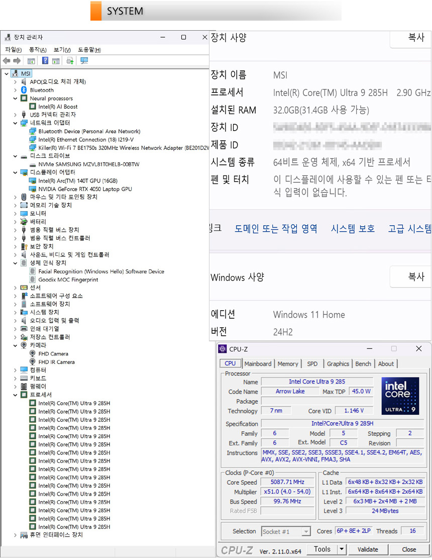 시스템 정보를 확인하고 있는 모습으로 6개의 성능코어와 8개의 효율코어에 2개의 초저전력 코어가 추가된 인텔코어 울트라 9 285H 프로세서가 장착된 것을 확인할 수 있다. 특히 구형 프로세서와 달리 NPU가 탑재되어 있어 AI 작업에 특화된 모습으로 보여준다.