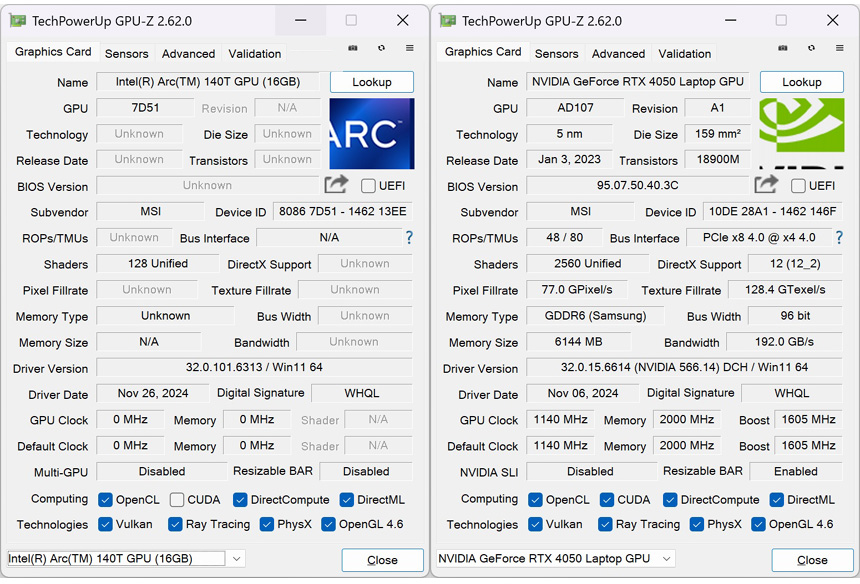 내/외장 그래픽의 스펙을 확인하고 있는 모습으로 RTX 4050은 1605MHz 의 부스트 클럭으로 작동하며 6GB 의 GDDR6 비디오 전용램이 설치된 것을 확인할 수 있다. @ 이 제품은 생산성에 특화된 노트북으로 엔비디아 스튜디오 드라이버를 설치하기 바란다.