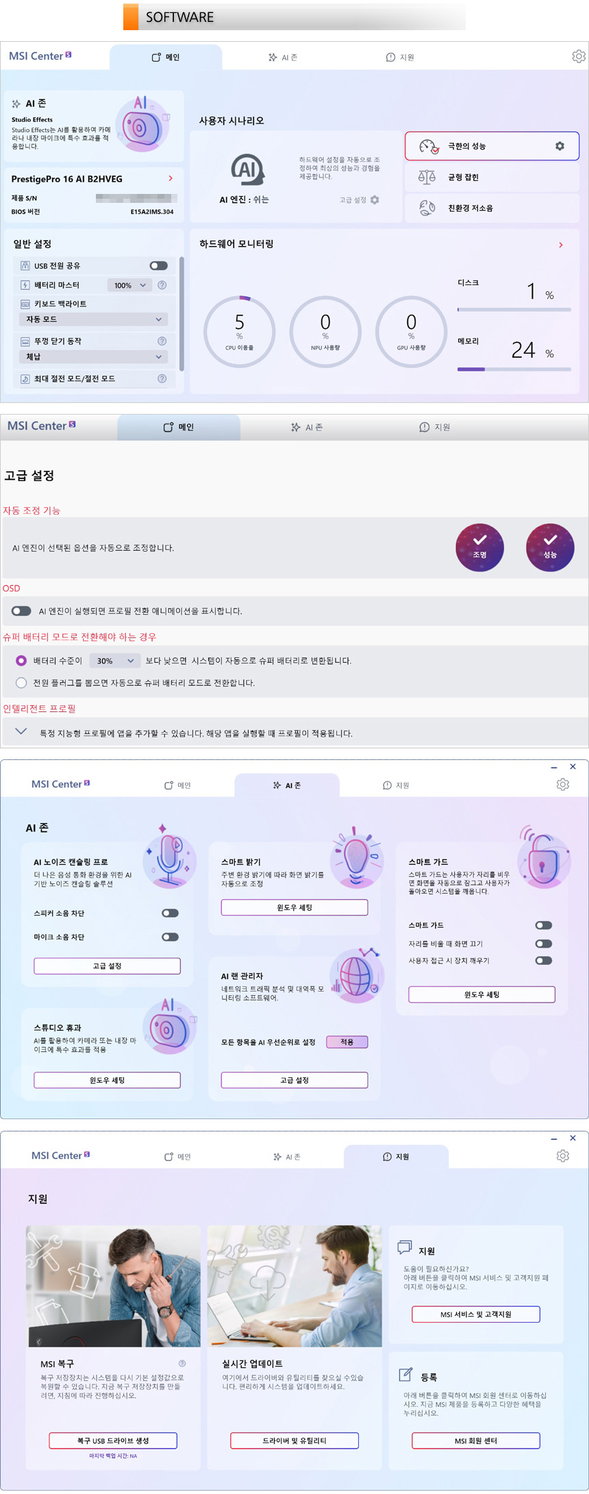 전용 S/W인 MSI 센터S 의 모습으로 기존과는 UI가 확연히 달라진 것을 확인할 수 있다. 메인화면에서 중요한 대부분의 설정이 가능한 것이 눈에띄며 다양한 AI 기능을 지원해 편의성을 높였다. 또한 지원에서는 복구 메뉴가 제공되며 업데이트를 통해 최상의 컨디션으로 노트북을 사용할 수 있다.