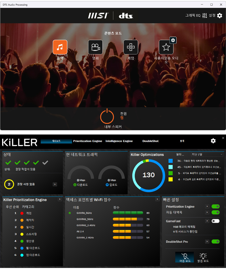 다양한 프로파일을 제공하는 DTS 오디오 지원으로 사용자에 맞는 사운드를 즐길 수 있으며 킬러 무선랜을 지원하는 모델답게 설정을 위한 전용 S/W를 제공한다.