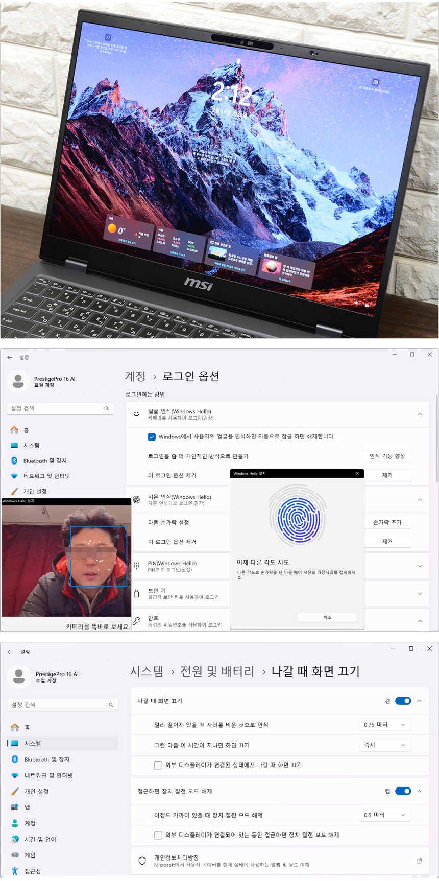 특히 이 제품은 도입부에서 언급한 것과 같이 인체감지 기술을 제공한다. 사용자가 자리를 비우면 화면이 자동으로 꺼지며 다시 자리로 오면 절전 모드가 해제되어 보안성과 편의성을 한층 높일 수 있다. @ 이 기능은 얼굴인식과 함께 사용하는 것을 적극 권장한다. 외부에서 자리를 비우면 자동으로 화면이 꺼지며 노트북이 잠금 상태가 되며 사용자가 자리에 앉으면 얼굴을 인식해 자동으로 켜지며 로그인 된다. 인체감지 설정은 설정->개인정보 및 보안->존재감지->존재감지 설정에서 셋팅할 수 있다.
