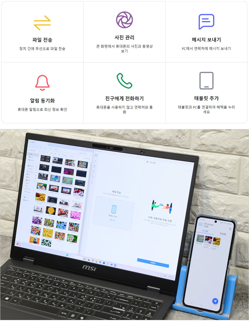 인텔 유니슨을 사용하면 노트북에서 전화를 걸거나 문자 등을 전송할 수 있다. 또한 파일전송 기능을 제공해 사진과 같이 상호간 파일전송이 가능하다. (업무용으로 스마트폰을 사용하고 있다면 유용하게 기능을 활용할 수 있을 것이다.)