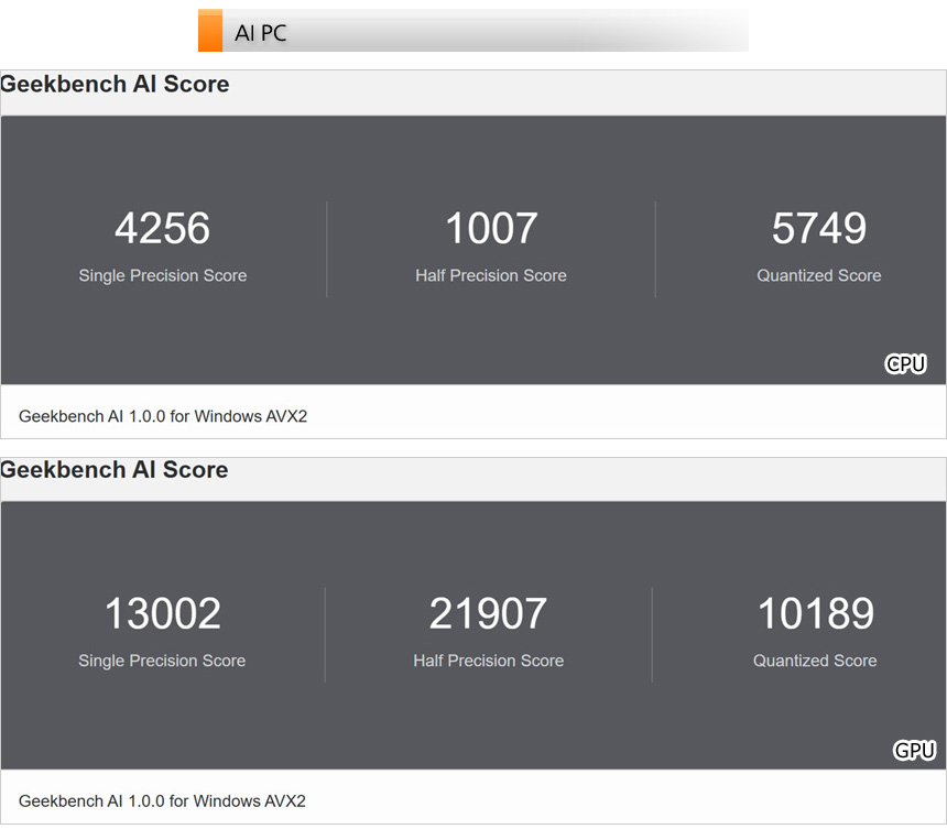 AI 전용 벤치마크 툴을 이용해 AI 성능 테스트를 진행하고 있는 모습으로 AI 에 특화된 CPU와 외장 그래픽이 탑재된 모델답게 슬림 노트북과 확연한 스코어 차이를 보여주었다.