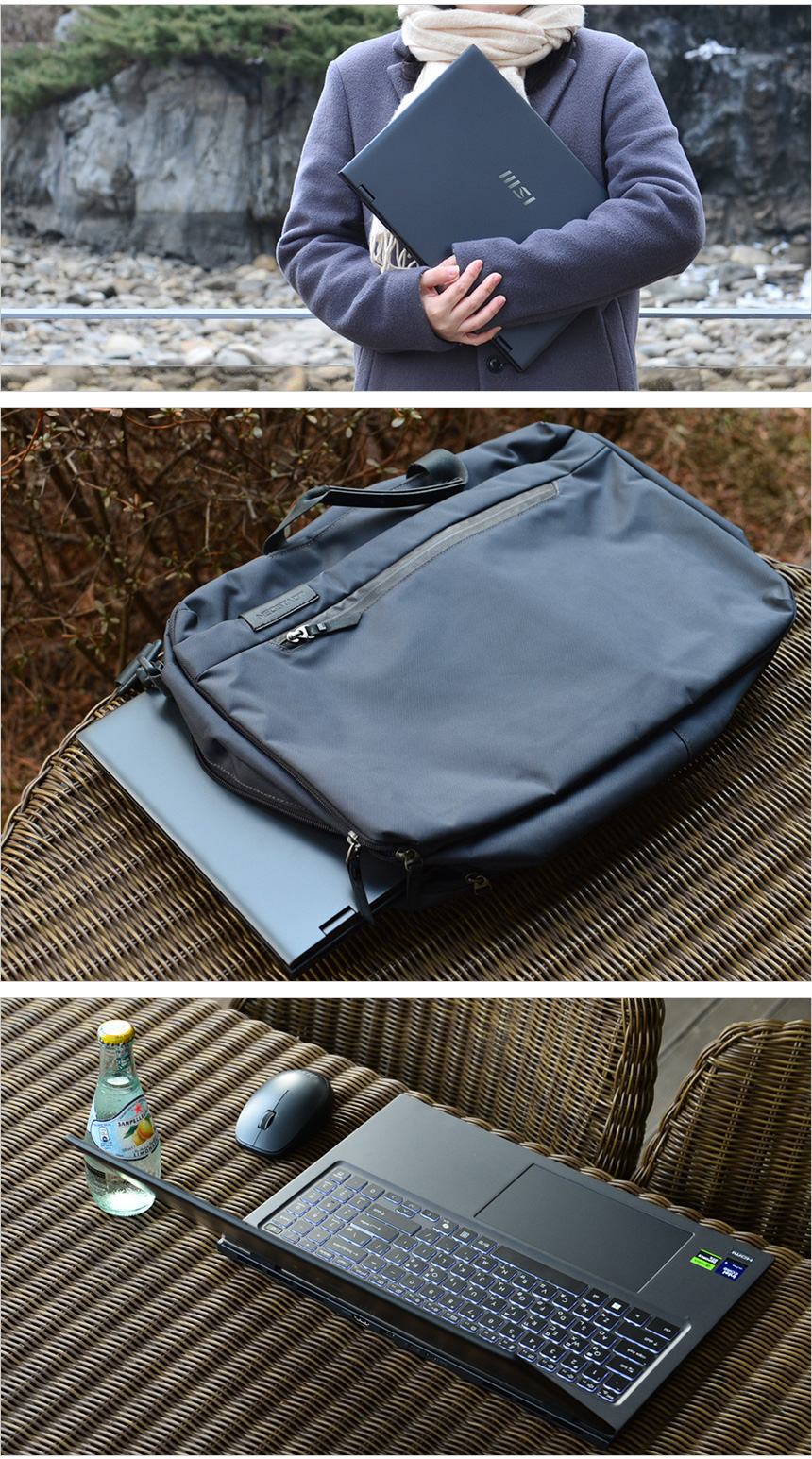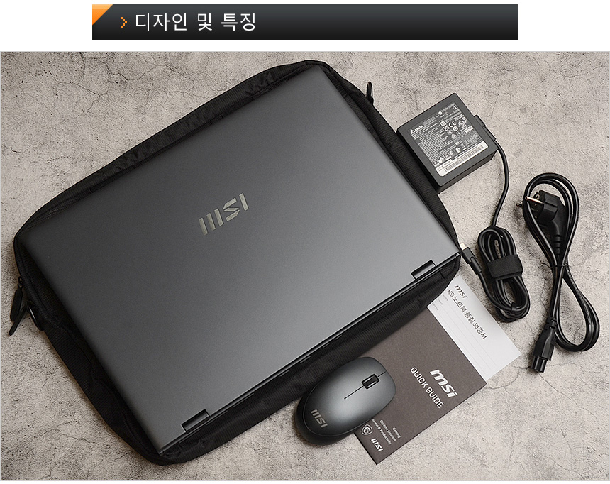 풀KIT 의 모습으로 노트북을 비롯해 C타입의 140W 전원 어댑터와 전원 케이블이 제공되며 퀵 매뉴얼과 보증서가 포함된 것을 확인할 수 있다. 또한 손쉽게 휴대할 수 있도록 전용 가방이 제공되며 무선 마우스를 지원해 외부에서 편하게 노트북을 사용할 수 있다.