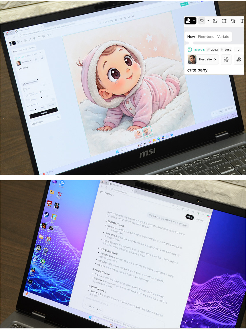 AI 대중화를 이끈 Ghat GPT를 실행한 모습으로 빠르게 실행되는 것을 확인할 수 있었으며 생성형 AI (ReCraft) 를 이용해 텍스트를 그림으로 만들어 보았는데 딜레이 없이 빠르게 작동하는 것을 확인할 수 있었다.