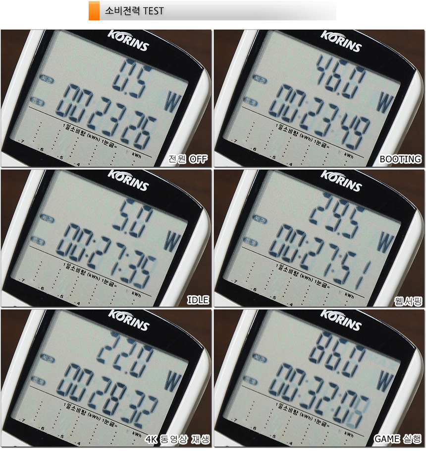 소비전력 테스트를 진행하고 있는 모습으로 (최고 성능 모드) 캐주얼한 작업에서는 10~30W 대의 소비전력으로 작동했으며 게임 실행시에는 90W 까지 소비전력이 올라가는 것을 확인할 수 있다.