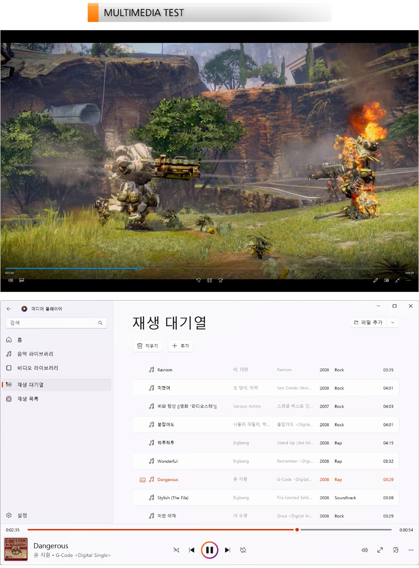 또한 MP3 파일을 이용해 스피커 사운드 테스트를 진행하고 있는 모습으로 게이밍 노트북 못지 않은 높은 출력은 물론 밀도감 높은 단단한 사운드를 들려주는 것을 확인할 수 있었다. 특히 중고음 뿐만 아니라 저음도 일정수준 이상으로 재생되어 음악을 편하게 들을 수 있었다.