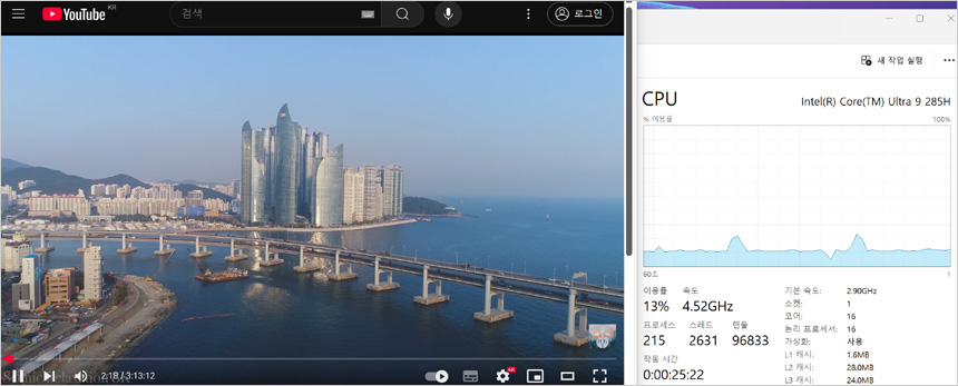 유튜브 고화질 동영상을 이용해 CPU 점유율을 테스트 하고 있는 모습으로 (2160P@60FPS) 3-11% 대의 점유율을 보여 주었으며 인터넷을 실행했을 때 30% 초반까지 점유율이 올라가는 것을 확인할 수 있었다. (변화가 심한 일부 노트북과 달리 CPU 점유율이 상당히 안정적이었다.)