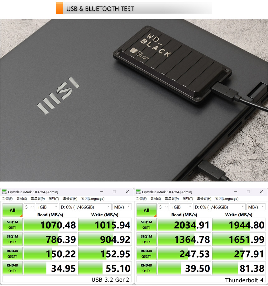 썬더볼트 4 단자를 지원해 빠른 데이터 전송이 가능하다. 상단의 사진은 외장 SSD (USB 3.2 Gen2x2 지원모델) 를 이용해 테스트를 진행하고 있는 모습으로 USB 3.2 Gen2와 확연한 차이를 보여주는 것을 확인할 수 있다.