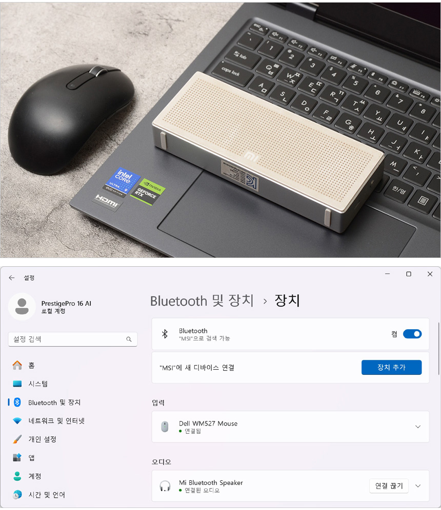 블루투스를 지원해 다양한 액세서리를 무선으로 연결할 수 있다. 상단의 사진은 스피커와 마우스의 연결 모습으로 원활하게 페어링 되는 것을 확인할 수 있었으며 완벽하게 작동했다.