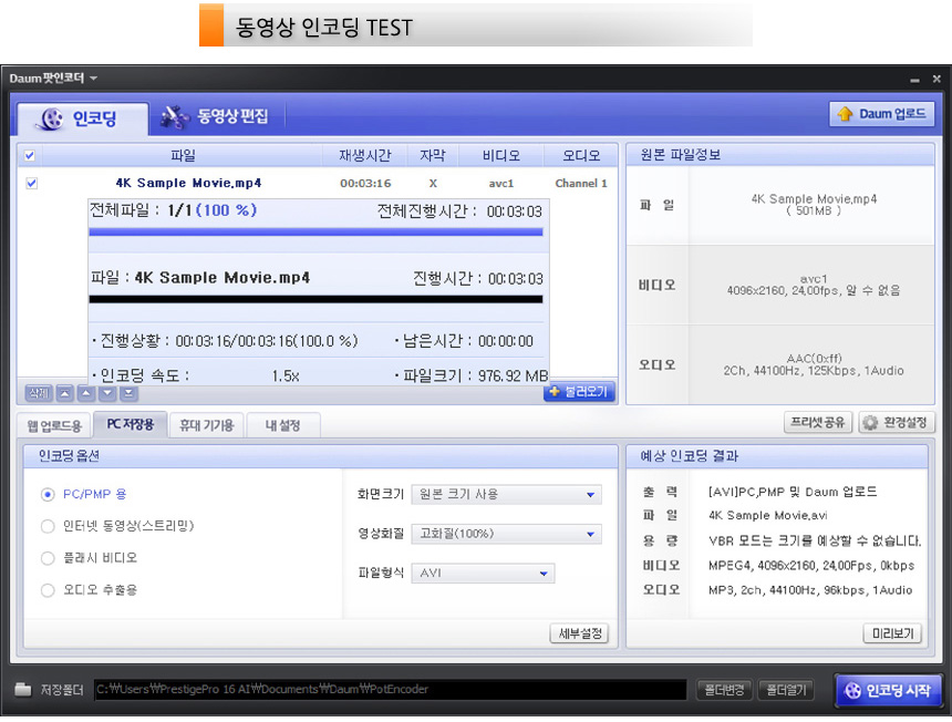 다음 팟인코더를 이용해 4K 동영상의 인코딩을 진행하고 있는 모습으로 최상급 프로세서가 탑재된 모델답게 3분 03초의 빠른 인코딩 시간을 보여주었다. (전작대비 20초 이상 인코딩 시간이 단축되었다.)