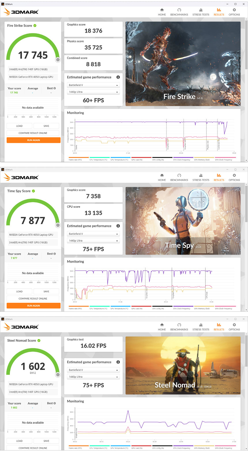 3DMARK를 이용해 외장그래픽의 성능을 확인하고 있는 모습으로 RTX 4050이 탑재되어 최고급형 게이밍 노트북 수준에는 미치지 못했지만 게이밍 용도로 충분히 사용할 수 있는 스코어를 보여주었다. (DLSS 와 같은 스케일링 기술을 적극 활용하기 바란다.)