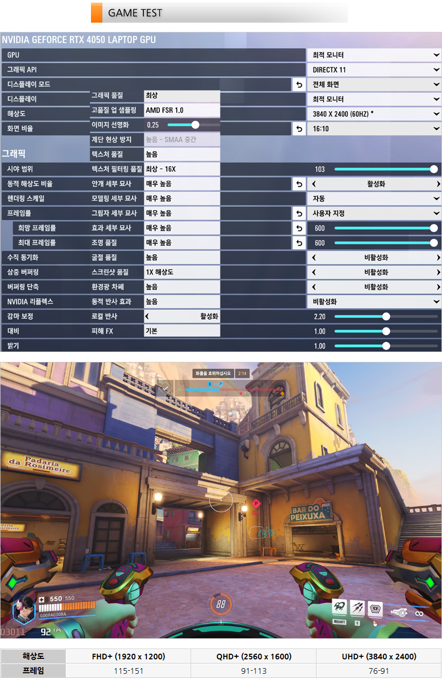 오버워치를 이용해 게임 테스트를 진행하고 있는 모습으로 최상 옵션으로 플레이 했을때 4K 해상도 에서도 80 프레임 이상으로 게임 플레이가 가능했다. 여유롭게 게임을 즐길 수 있을 것이다.