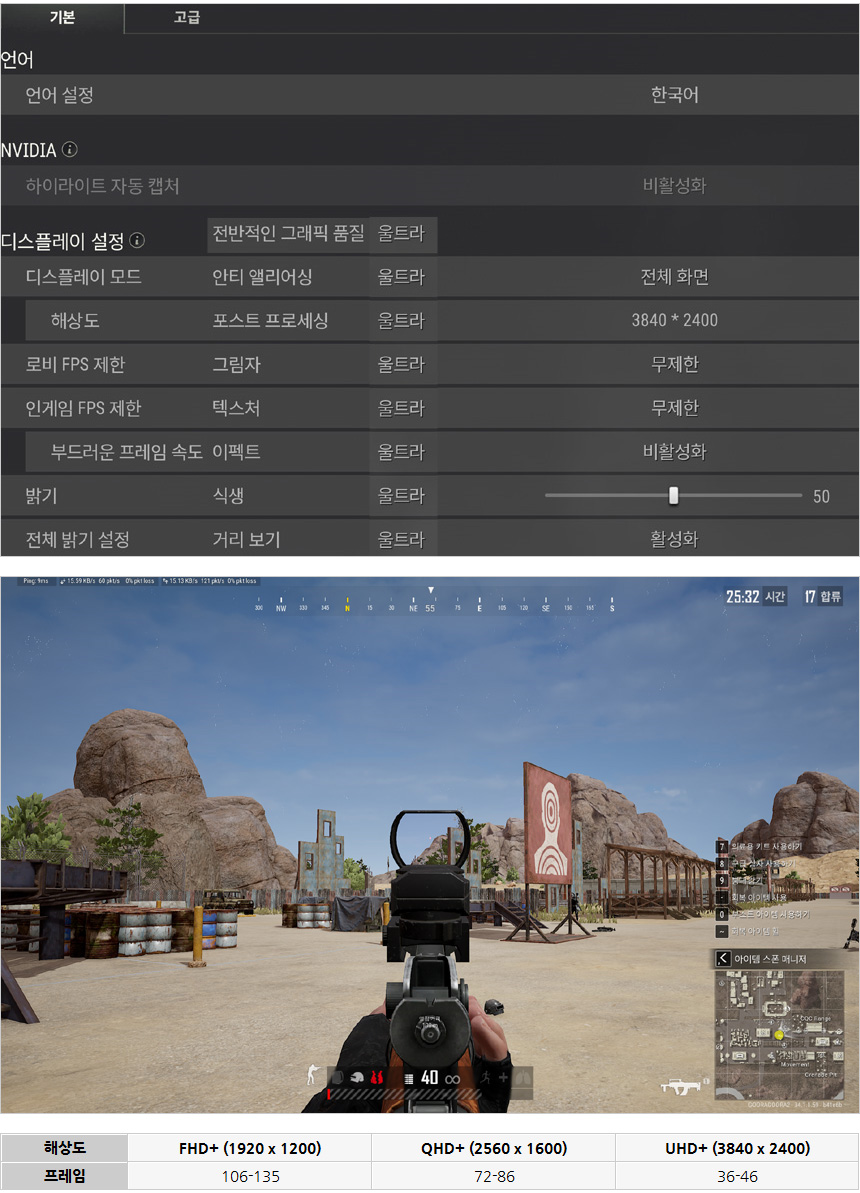 배틀그라운드를 플레이 하고 있는 모습으로 (연습장 맵) 울트라 옵션으로 설정시 4K 해상도는 살짝 벅찬 것을 확인할 수 있었다. (국민옵션 등을 적용하거나 해상도를 낮추기 바란다.)