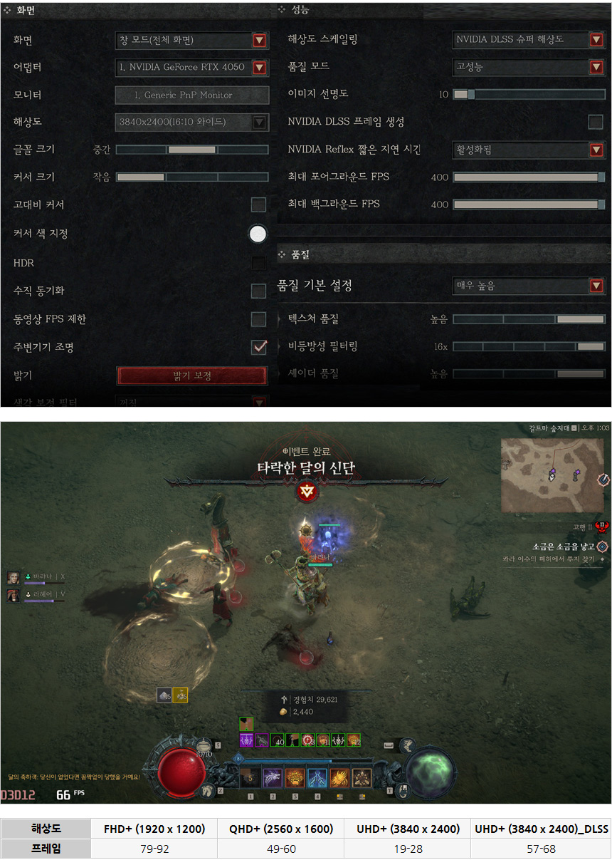 디아블로 4를 매우 높음 옵션으로 플레이 하고 있는 모습으로 스케일링을 적용하지 않는 일명 깡성능 에서는 4k 해상도 게이밍이 쉽지 않았다. 하지만 DLSS를 고성능으로 지정하고 게임을 실행하니 50프레임을 가볍게 넘겨 부드럽게 게임을 즐길 수 있었다.