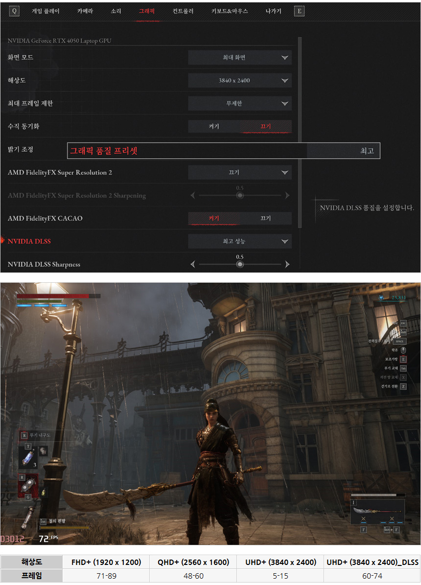 P의 거짓을 최고 옵션에서 플레이 하고 있는 모습으로 4K 해상도 게이밍은 불가했지만 DLSS를 사용하니 60 프레임을 넘겨 부드럽게 게임을 즐길 수 있었다. (RTX 4050 이 엔트리급 GPU 이기 때문에 스케일링 기술을 적극적으로 활용해야 한다.)