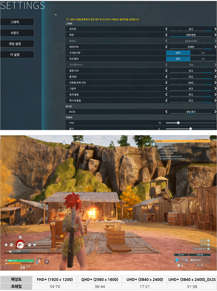 팰월드를 최고 옵션으로 플레이 하고 있는 모습으로 P의 거짓과 마찬가지로 4K 해상도에서는 원활하게 게임을 플레이 하기 힘들었지만 DLSS를 적용하니 30프레임을 넘겨 훨씬 부드러운 움직임을 보여주었다. (4K 보다는 QHD+ DLSS 적용을 추천한다.)