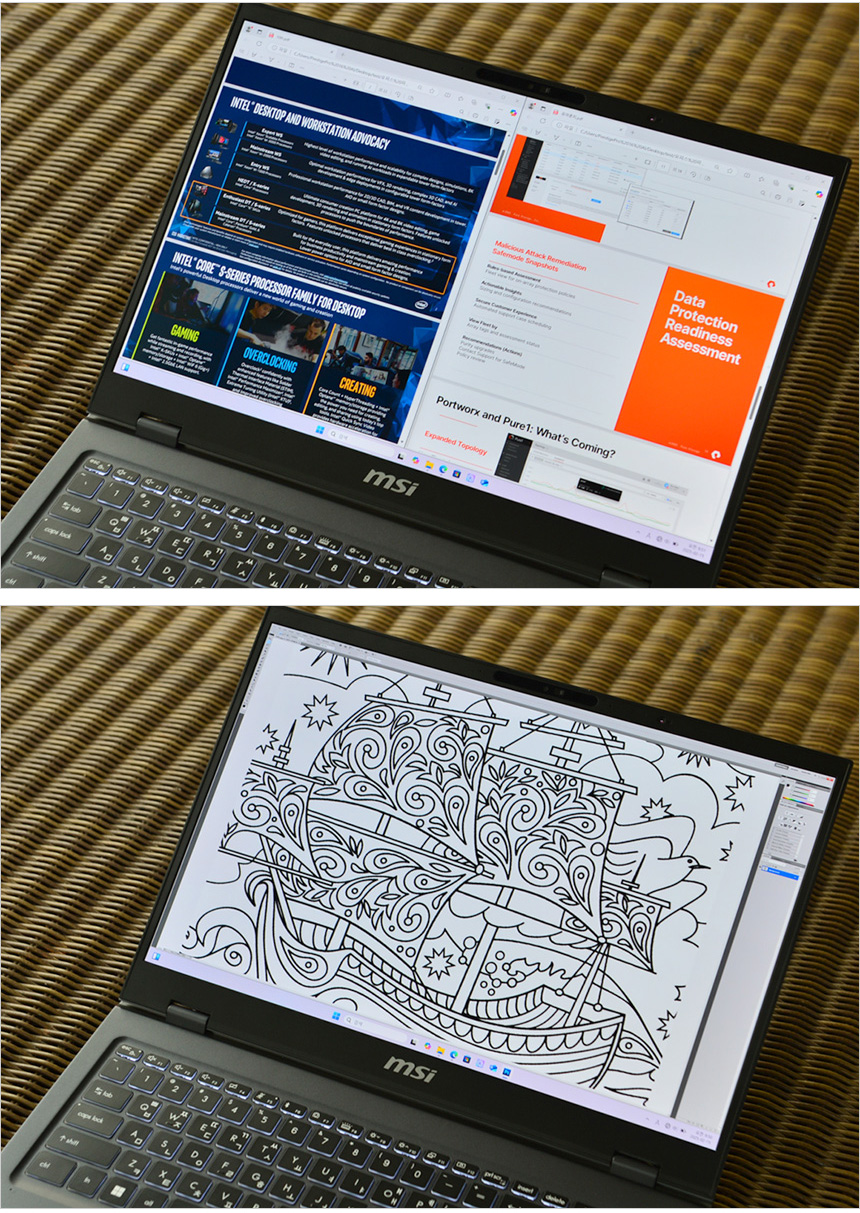 최상급의 디스플레이 탑재도 아주 만족스러웠다. IPS 타입 패널을 사용했던 전작과 달리 강렬한 색감과 진한 블랙 표현이 매력적인 OLED 패널을 사용했을 뿐만 아니라 16형 대화면에 16:10 황금비율 지원으로 사용성을 한층 높였다. UHD+ 고해상도 지원으로 디테일 까지 살려 보다 편하게 디자인이 작업을 할 수 있다.