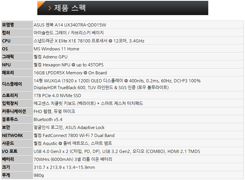 이번에 리뷰를 진행 할 ASUS 젠북 A14 UX3407RA-QD015W 는 말씀드린 모든 조건들을 만족시키는 프리미엄 슬림 노트북으로 980g 에 불과한 가벼운 무게로 1Kg 초중반의 무게를 가진 경쟁모델 대비 편하게 들고 다닐 수 있으며 14형 디스플레이 탑재로 크기를 최소화 해 파우치를 사용해 단독 휴대하거나 일반 가방에 넣고 다니며 사용할 수 있다.