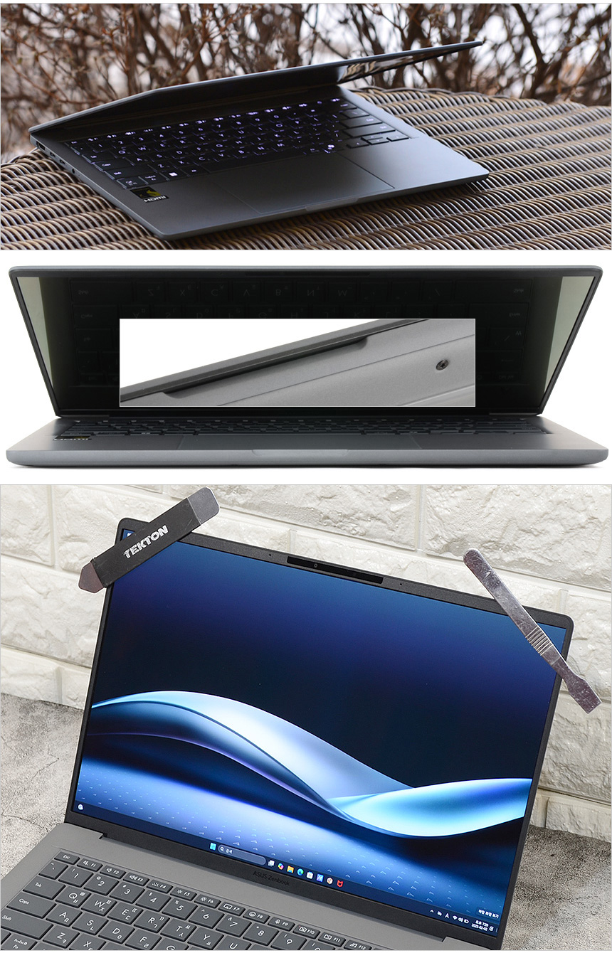 노트북 전면부의 모습으로 한손으로 쉽게 상판을 오픈할 수 있도록 설계된 것을 확인할 수 있다. (무게중심을 고려한 설계로 상판 오픈시 하판이 쉽게 따라 올라오지 않았다.) 특히 힌지의 압력이 높은 편으로 어떤 각도에서도 중력으로 인한 흘러내림 현상은 발생하지 않았다. 또한 마그네틱이 부착되어 이동중 상판열림 으로 인한 패널 스크레치나 파손 등이 발생하는 것을 미연에 방지한다.