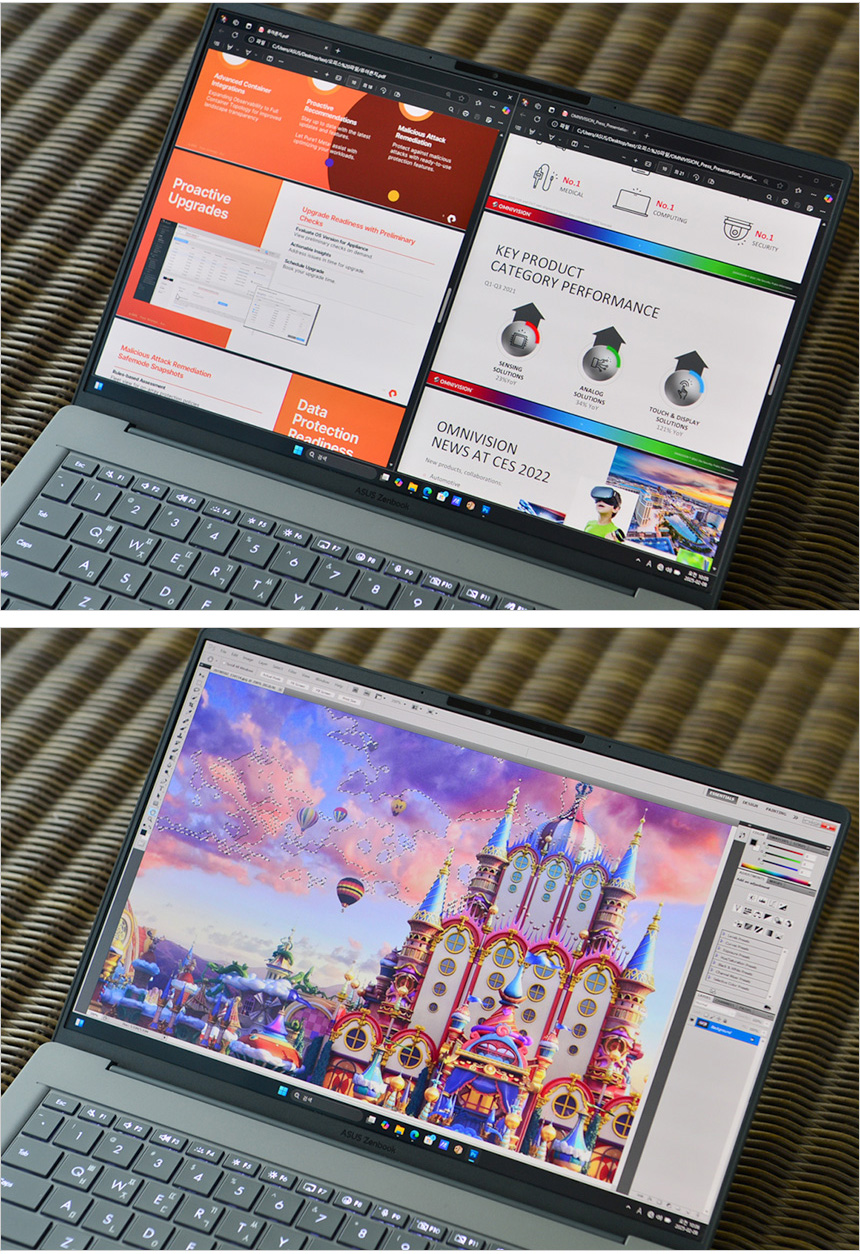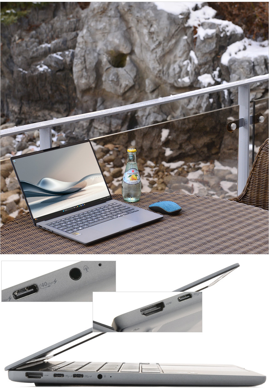 또한 PD충전과 디스플레이 출력을 지원하는 USB 4 단자를 지원해 편의성을 높였으며 인체감지와 얼굴인식 로그인 지원으로 외부에서도 중요 자료를 안전하게 관리할 수 있다. 또한 30시간 이상의 (ASUS 측정기준) 긴 배터리 사용시간을 지원해 어디서나 배터리 걱정없이 사용할 수 있으며 일반 알루니늄 소재대비 가볍지만 내구성은 훨씬 뛰어난 하이테크 세라믹 알루미늄 소재를 사용해 이동중 발생할 수 있는 마모나 스크레치, 파손 가능성을 최소화 했다.