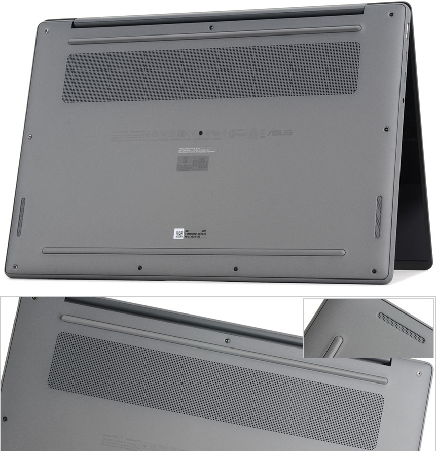 노트북 바닥면의 모습으로 상단과 하단에 고무패드가 설치되어 충격 등으로부터 제품을 보호할 뿐만 아니라 미끄러짐을 방지한다. 또한 하단 양 측면에는 돌비 애트모스를 지원하는 스피커가 설치되어 퀄리티 높은 사운드를 즐길 수 있다.