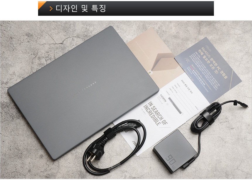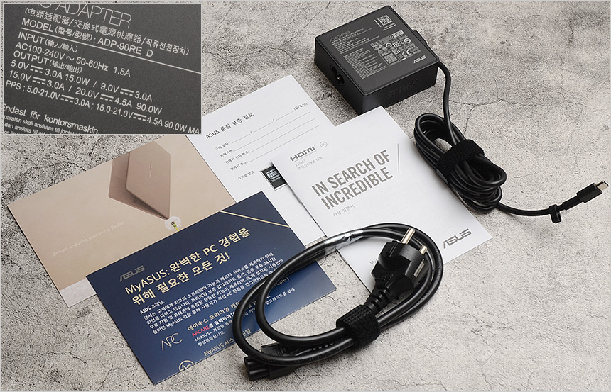 기본 제공되는 액세서리의 모습으로 90W 전원 어댑터와 케이블, 설명서와 보증서 등이 포함되어 있다.