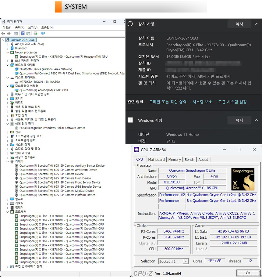 시스템 정보를 확인하고 있는 모습으로 12코어로 구성된 스냅드래곤 X 엘리트 프로세서가 장착된 것을 확인할 수 있으며 AI 노트북 답게 NPU도 탑재된 것을 확인할 수 있다. 16GB 메모리와 1TB 의 넉넉한 저장공간을 지원해 성능이나 용량걱정 없이 편하게 노트북을 사용할 수 있으며 윈도우 11 Home을 탑재해 편하게 노트북을 사용할 수 있다.