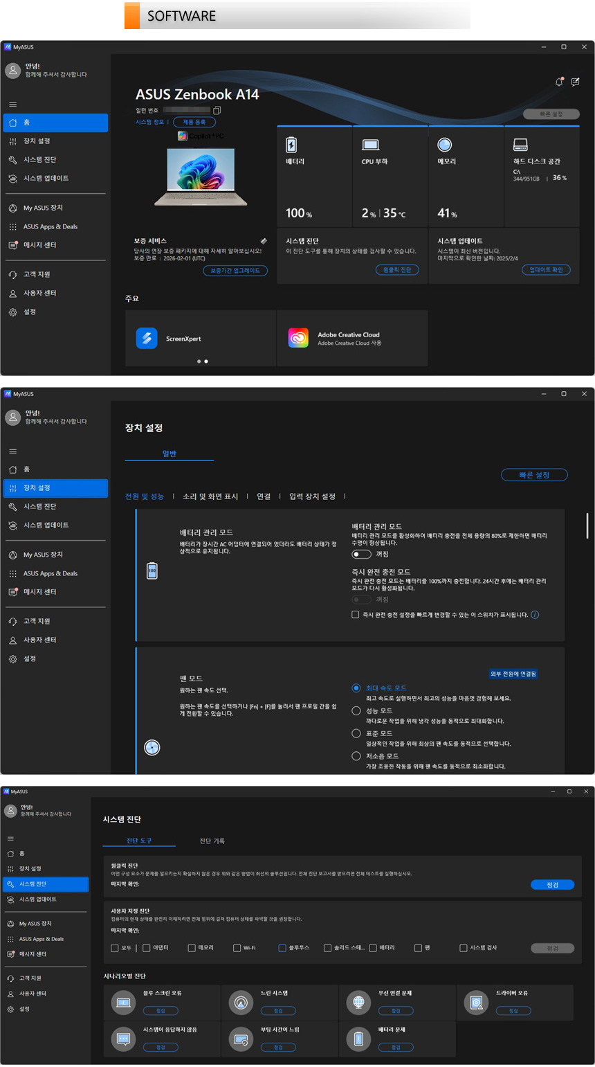 MyASUS 앱을 실행한 모습으로 (키보드에서 핫키를 지원해 빠른 실행이 가능하다.) 업데이트를 지원해 최상의 컨디션을 유지할 수 있으며 원클릭 진단 기능을 지원해 시스템의 문제를 빠르게 파악할 수 있다. @ 팬모드나 디스플레이, 배터리등 세부 설정은 동영상을 통해 확인하기 바란다.